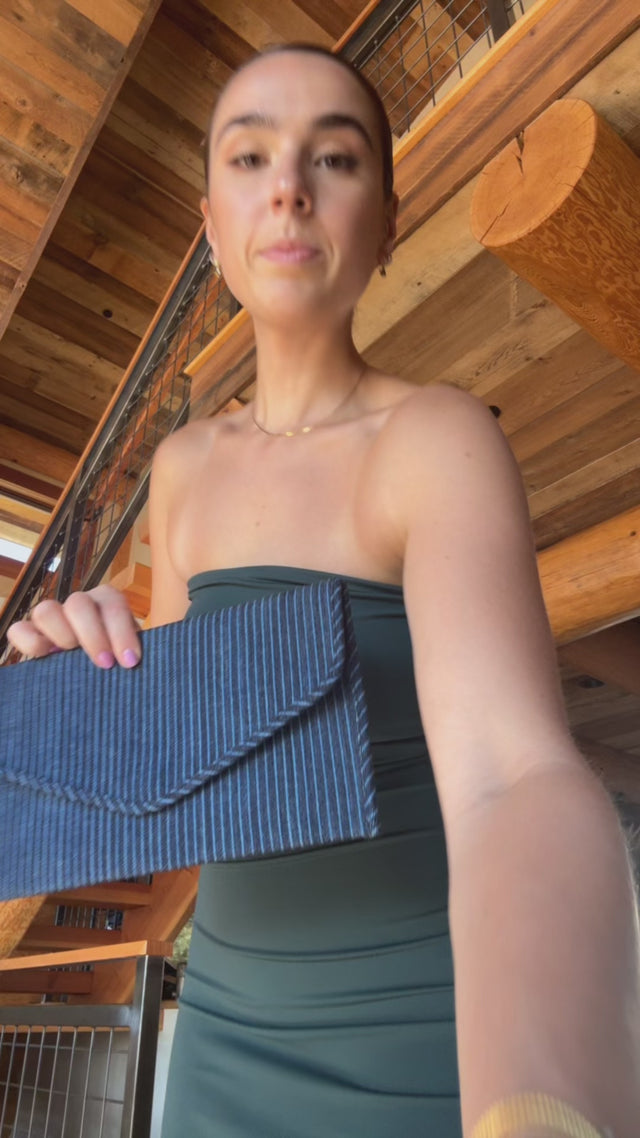 This pinstripe envelope-style clutch, made from deadstock fabrics, measures 11 x 17 inches. It features a magnetic snap closure and fits many personal items, including any size iPhone.